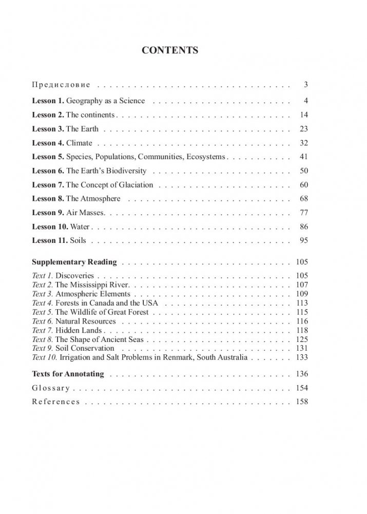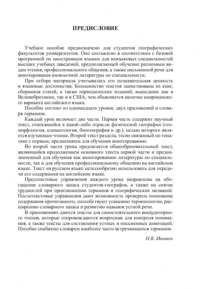 Цель пособия - обучить студентов-географов различным видам чтения, переводу, аннотированию иноязычной литературы по специальности, а также сформировать у них навыки устной монологической речи. Тексты являются аутентичными, заимствованными из британских и американских источников. Может быть использовано как для аудиторной, так и для самостоятельной работы.