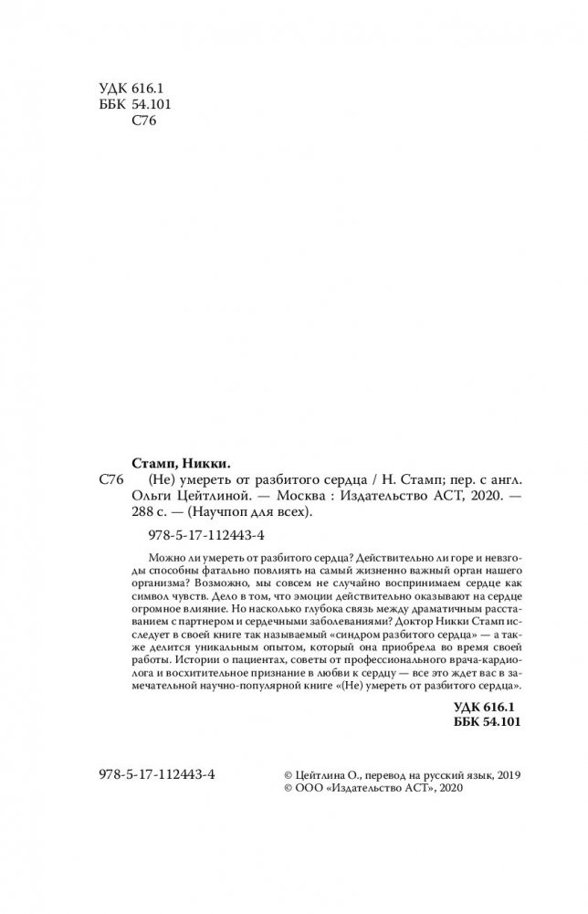 Можно ли умереть от разбитого сердца? Действительно ли горе и невзгоды способны фатально повлиять на самый жизненно важный орган нашего организма? Возможно, мы совсем не случайно воспринимаем сердце как символ чувств. Дело в том, что эмоции действительно оказывают на сердце огромное влияние. Но насколько глубока связь между драматичным расставанием с партнером и сердечными заболеваниями? Доктор Никки Стамп исследует в своей книге так называемый «синдром разбитого сердца» — а также делится уникальным опытом, который она приобрела во время своей работы. Истории о пациентах, советы от профессионального врача-кардиолога и восхитительное признание в любви к сердцу — все это ждет вас в замечательной научно-популярной книге «(Не) умереть от разбитого сердца».