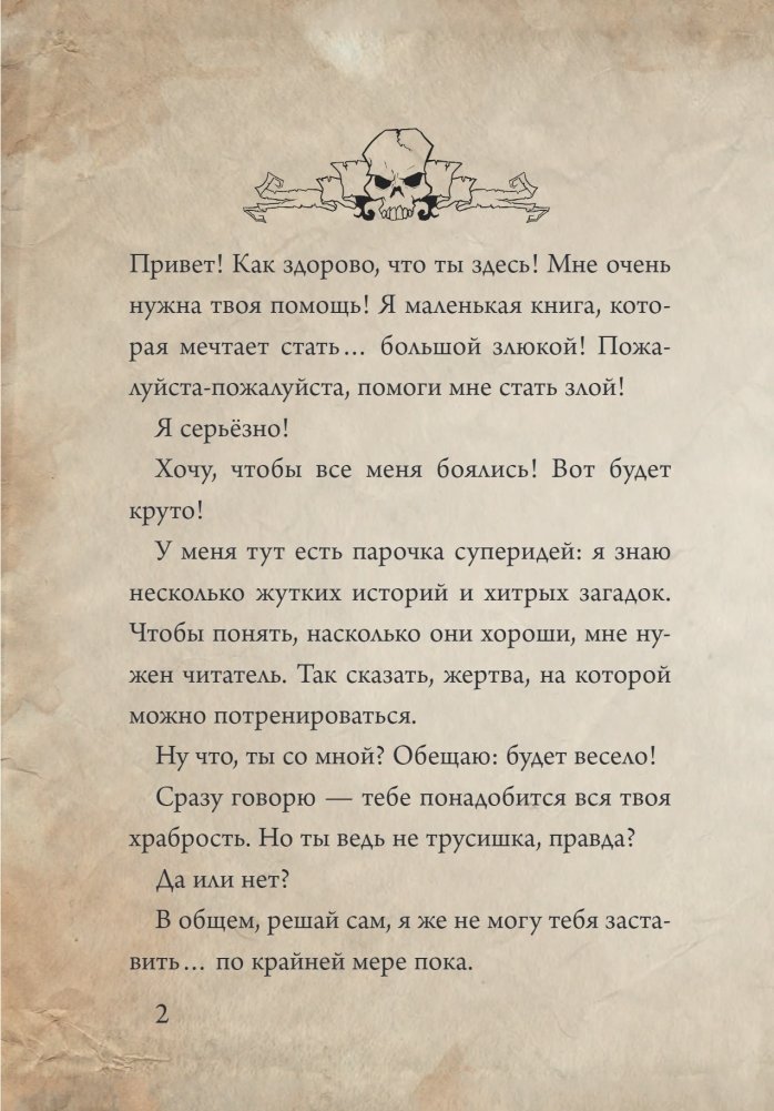 У этой маленькой книги есть большая мечта: она хочет стать самой злой на свете! Рассказывать страшные и захватывающие истории, от которых замирает сердце, — вот о чём грезит этот небольшой томик. Но справиться самому у него не получится, ему просто НЕОБХОДИМ смелый, умный и суперклассный читатель — то есть ты! Да-да, ты! Нет никаких сомнений, что ты не трусливый зайка, а настоящий герой, который запросто решит все загадки, пройдёт хитроумный квест и не испугается каких-то там страшилок! Осталось только открыть первую страницу и пуститься в невероятные приключения с кучей сюрпризов и тайн. Будет весело!