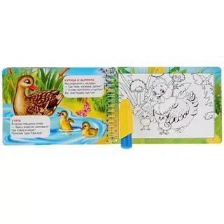 Теперь чтобы раскрасить картинку достаточно провести по ней маркером, предварительно наполненным водой. Интересные иллюстрации с домашними животными не только скрасят досуг ребёнка, но и подготовят его к школе. Раскраска на спирали в игровой манере подготовит руку ребёнка к письму. Благодаря удобному формату её можно взять с собой в дорогу.