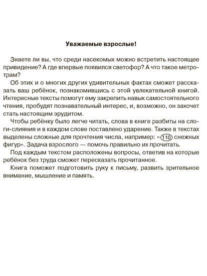 Чтобы поддерживать у ребенка интерес к чтению, мы собрали в нашей книге тексты познавательного содержания, которые особенно интересны современным детям. Для того чтобы чтение было не механическим, а осмысленным, к каждому тексту подобраны вопросы на понимание текста. Кроме того, к каждому рассказу даны лабиринты, обводки, сюжетные раскраски, которые помогут не только максимально увлечь ребенка, но и помогут переключить его с одного вида деятельности на другой. Для детей и родителей, педагогов и логопедов.