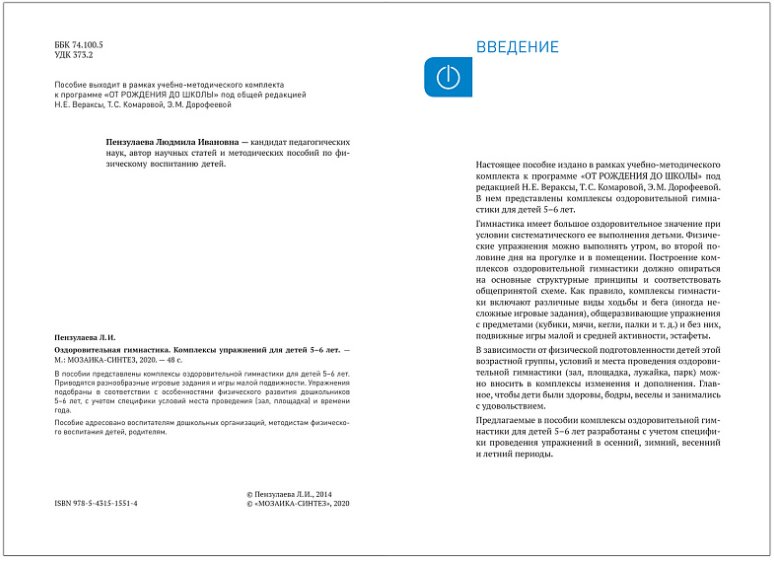 В пособии представлены комплексы оздоровительной гимнастики для детей 5–6 лет. Приводятся разнообразные игровые задания и игры малой подвижности. Упражнения подобраны в соответствии с особенностями физического развития дошкольников 5–6 лет, с учетом специфики условий места проведения (зал, площадка) и времени года.