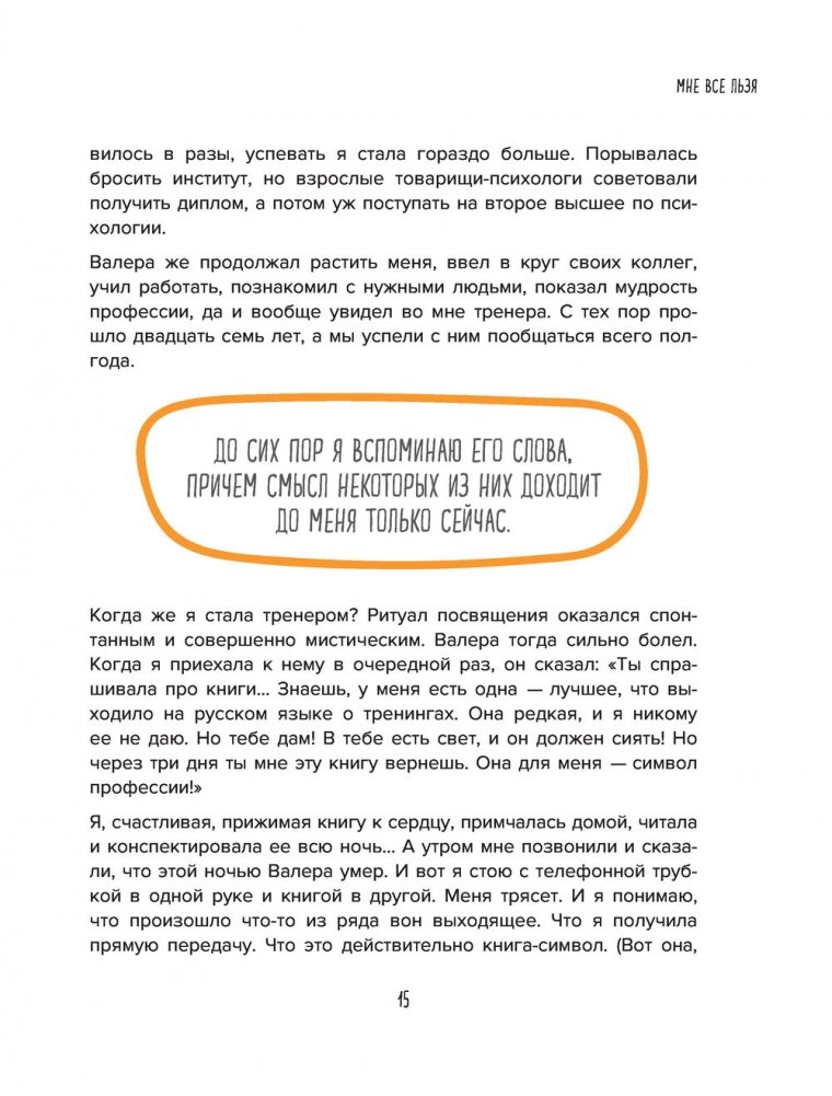 Книга «Мне все льзя. О том, как найти свое призвание и самого себя» помогает избавиться от внутренних ограничителей и наконец-то вычислить тот вид занятий, который вам по-настоящему подходит. И речь не о хобби. Речь о деле жизни, которое будет вас кормить, вдохновлять и делать абсолютно счастливым человеком.