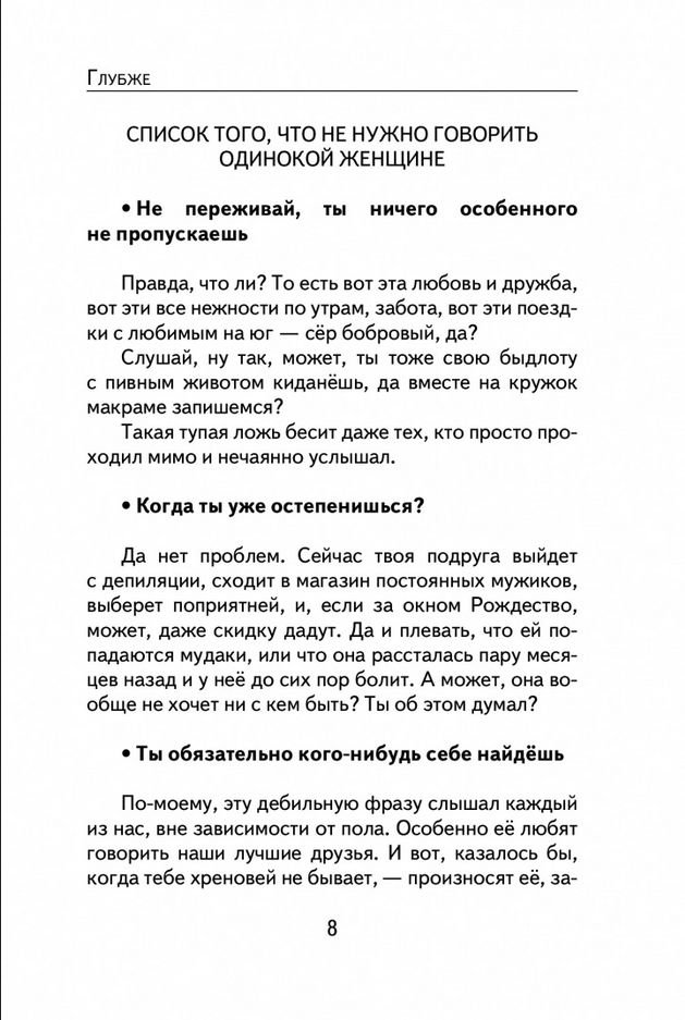«Глубже» — книга наблюдений за современным окружающим миром — его обитателями, героями, моралью — сквозь призму едкого, саркастичного, порой жесткого, но неизменно точного взгляда Васи Аккермана.
