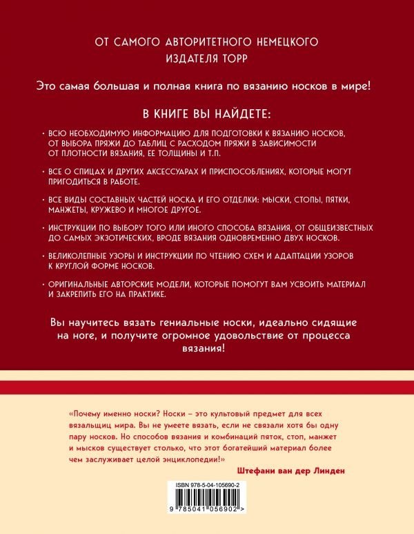 Носки — это то, что вяжут абсолютно все, даже те, кто берет спицы в руки раз в несколько месяцев. Это не просто предмет одежды, это культ, маркер мастерства вязальщицы. Вы не умеете вязать, пока не связали хотя бы одну пару носков. Это не так-то просто, ведь носки должны быть не просто теплыми и красивыми, они должны идеально сидеть на ноге. Стефани ван дер Линден, автор знаменитой энциклопедии "Вязание на спицах", создала концентрат ноу-хау, настоящую мастерскую гениальных носков. Стопа, манжета, пятка, мысок — каждая часть носка может быть связана множеством разных способов и каждая из них влияет на идеальную посадку. Подобрать правильную комбинацию и найти свой способ вязания, попробовать что-то совершенно необычное: связать носки сверху, или два носка одновременно, или лоскутные носки, или крохотные носочки для самых маленьких...