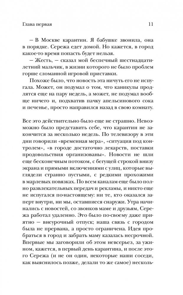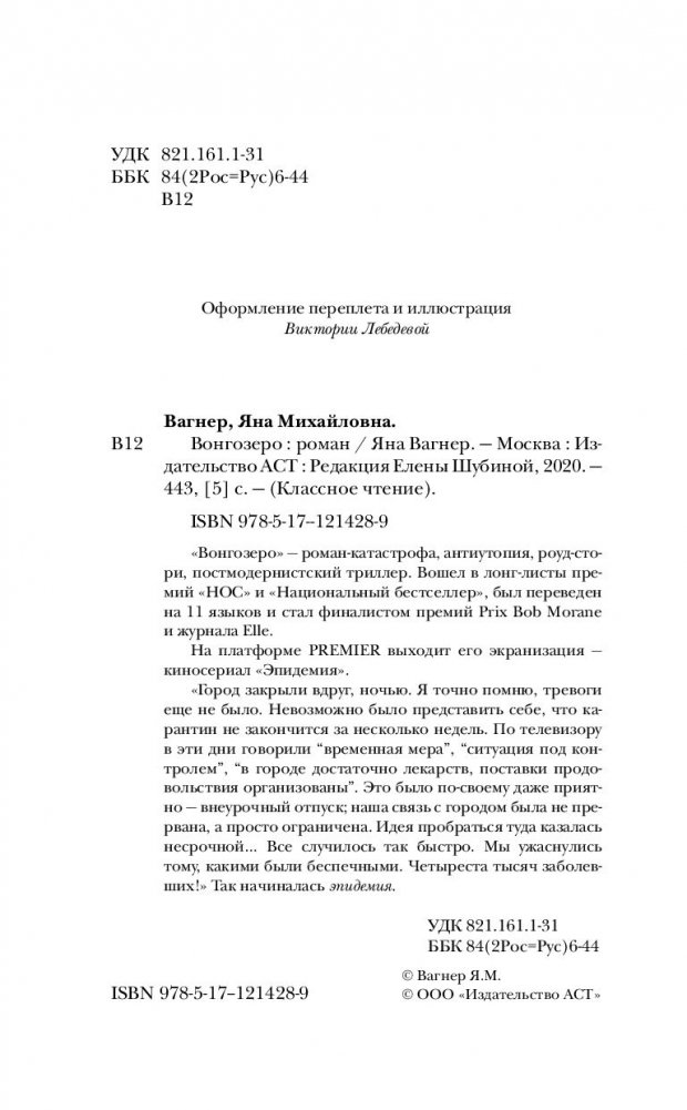 "Вонгозеро" — роман-катастрофа, антиутопия, роуд-стори, постмодернистский триллер. Вошел в лонг-листы премий "НОС" и "Национальный бестселлер", был переведен на 11 языков и стал финалистом премий Prix Bob Morane и журнала Elle. На платформе PREMIER выходит его экранизация — киносериал "Эпидемия". "Город закрыли вдруг, ночью. Я точно помню, тревоги еще не было. Невозможно было представить себе, что карантин не закончится за несколько недель. По телевизору в эти дни говорили “временная мера”, “ситуация под контролем”, “в городе достаточно лекарств, поставки продовольствия организованы”. Это было по-своему даже приятно — внеурочный отпуск; наша связь с городом была не прервана, а просто ограничена. Идея пробраться туда казалась несрочной… Все случилось так быстро. Мы ужаснулись тому, какими были беспечными. Четыреста тысяч заболевших!" Так начиналась эпидемия.