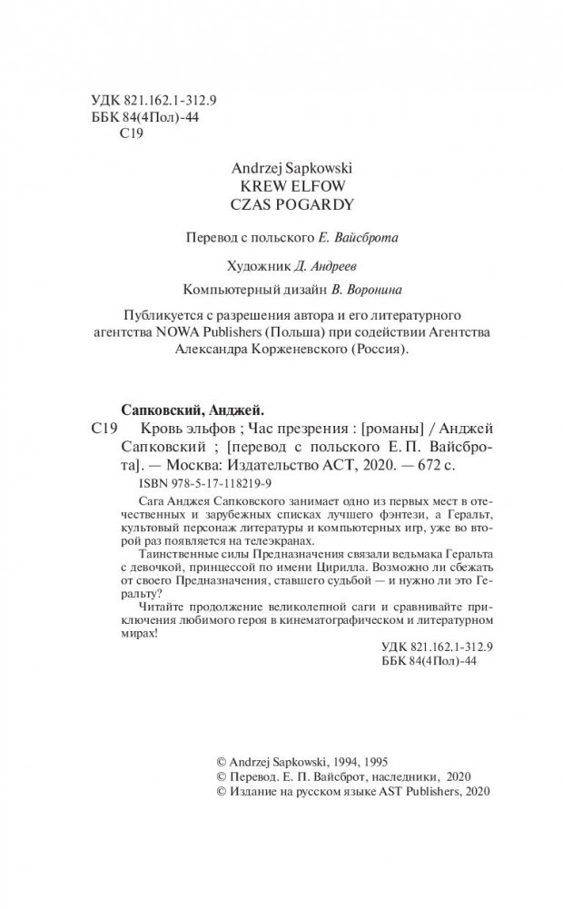 Таинственные силы Предназначения связали ведьмака Геральта с девочкой, принцессой по имени Цирилла. Возможно ли сбежать от своего Предназначения, ставшего судьбой – и нужно ли это Геральту?