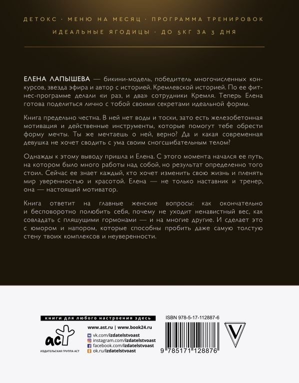 Книга предельно честна. В ней нет воды и тоски, зато есть железобетонная мотивация и действенные инструменты, которые помогут тебе обрести форму мечты. Ты же мечтаешь о ней, верно? Да и какая современная девушка не хочет сводить с ума своим сногсшибательным телом?