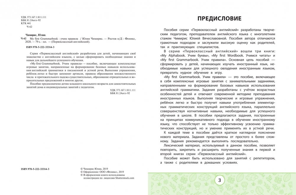 «My first Grammarbook. Учим правила» — пособие, включающее комплексные игровые занятия, направленные на формирование базовых навыков использования английской грамматики в письменной и устной речи. Выполняя упражнения, ребёнок легко и быстро запомнит артикли, правила образования множественного числа и притяжательного падежа существительных, образование отрицательных и вопросительных предложений и многое другое.