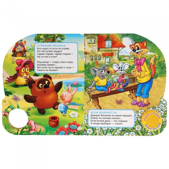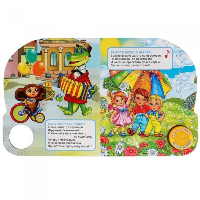 Ребёнок легко освоит включение звука: по нажатию на кнопку начинает проигрываться песенка, при втором нажатии звук выключится. Малыш с удовольствием будет рассматривать красочные, яркие странички с героями, слушать песни, подпевать и даже танцевать. Книжка сделана из плотного картона, поэтому мамы могут не опасаться, что ребёнок порвёт странички или поранит пальчики.