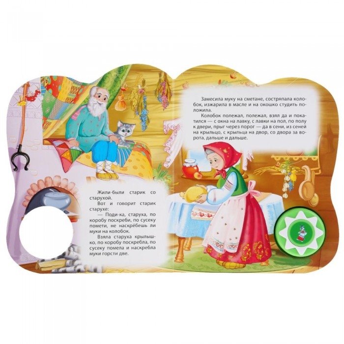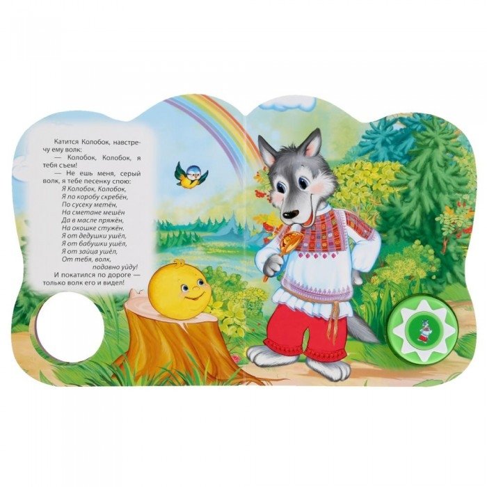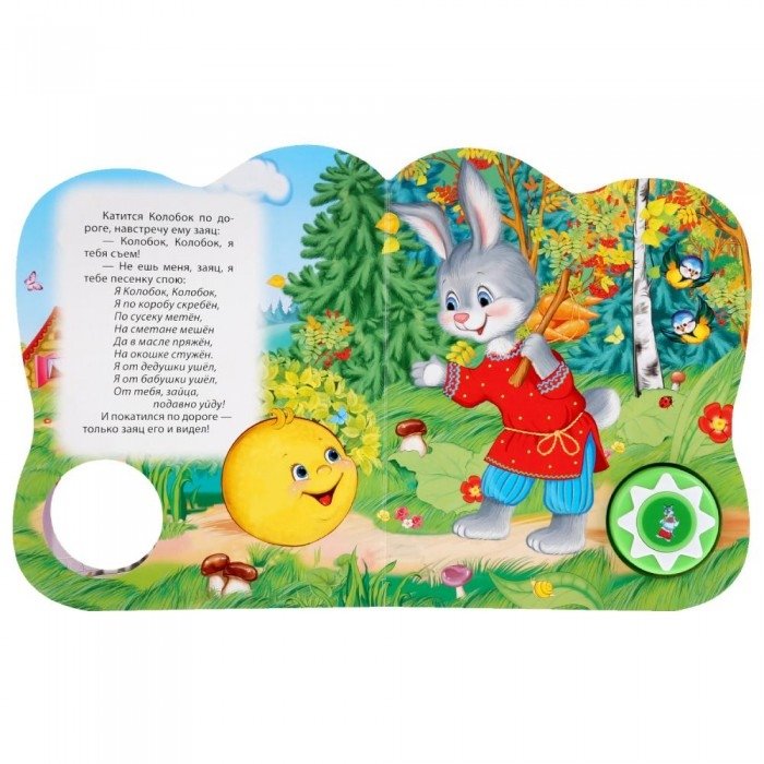 На картонных страницах этой книги представлена известная русская народная сказка о приключениях Колобка. Текст произведения дополнен красочными иллюстрациями, которые дети с интересом изучат, развивая при этом цветовосприятие и наглядно-образное мышление. А веселые песенки, воспроизводимые после нажатия на кнопочку в боковой части издания, сделают чтение сказки еще более увлекательным. Книга поможет детям развить речь и пополнить словарный запас, расширить кругозор и улучшить музыкальный слух. Страницы издания хорошо сохраняют форму и привлекательный внешний вид, так как выполнены из плотного, высококачественного картона.