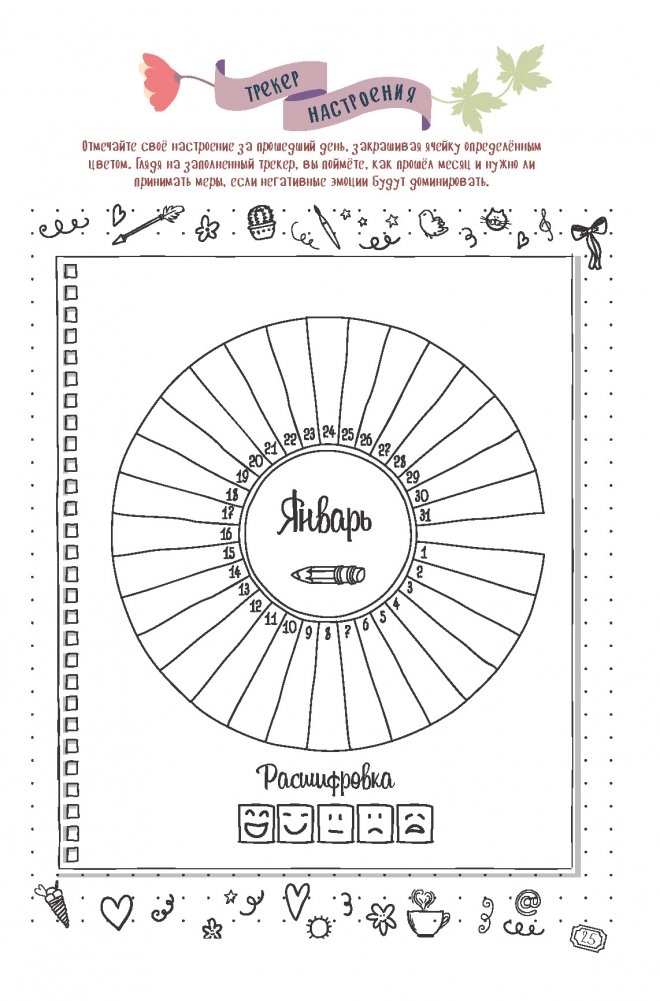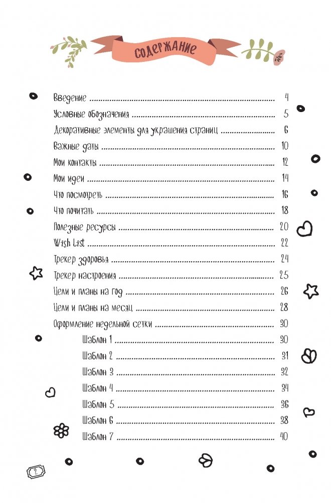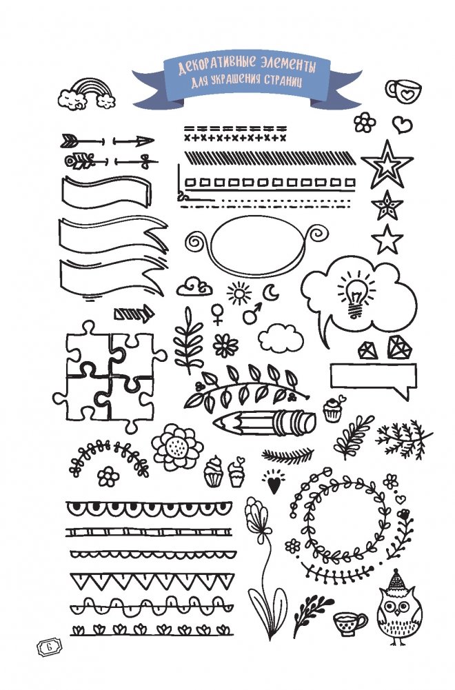 На первых страницах вашего bullet-ежедневника даны шаблоны для разных блоков: варианты недельной сетки для планера, всевозможные списки, трекеры и декоративные элементы, которыми можно украсить странички с записями.