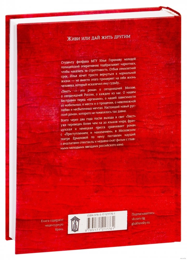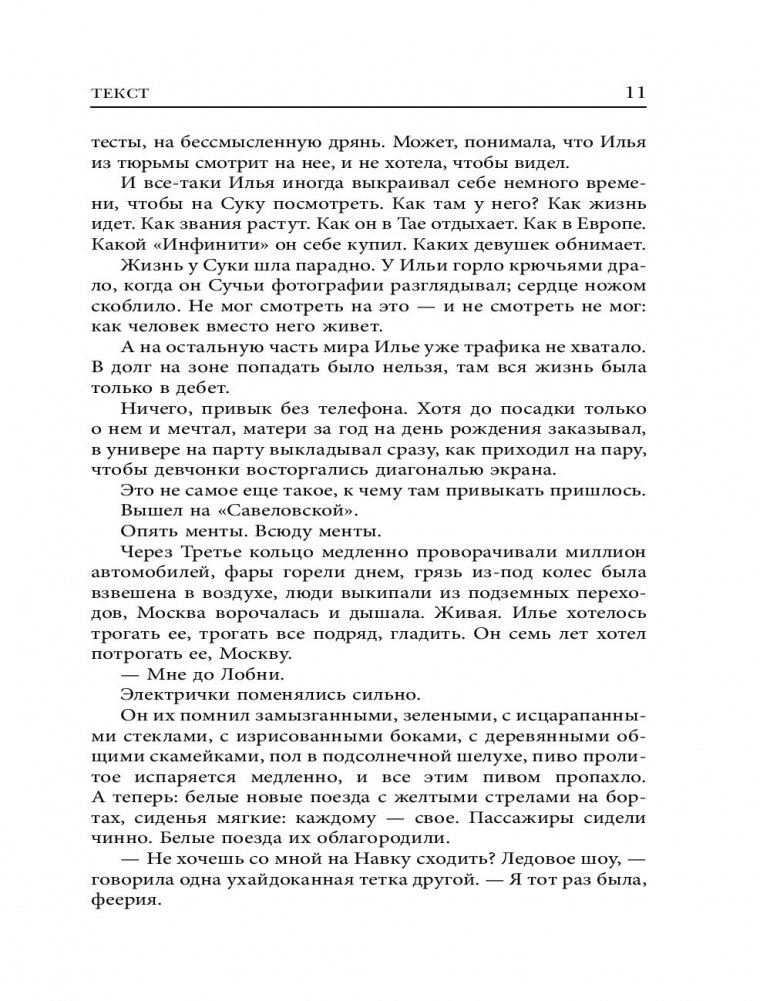 «Текст» – это роман о сегодняшней Москве, о сегодняшней России, о каждом из нас. О нашем бесправии перед «органами», о нашей зависимости от мобильных, о мести и о прощении, о невозможной любви и несбыточных мечтах. Настоящий новый русский роман, которого не появлялось так давно.