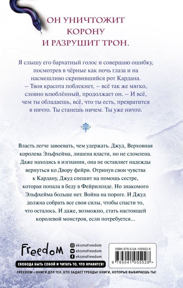 Власть легче завоевать, чем удержать. Джуд, Верховная королева Эльфхейма, лишена власти, но не сломлена. Даже находясь в изгнании, она не оставляет надежды вернуться ко Двору фейри. Отринув свои чувства к Кардану, Джуд спешит на помощь сестре, которая попала в беду в Фейриленде. Но знакомого Эльфхейма больше нет. Война на пороге. И Джуд должна собрать все свои силы, чтобы спасти то, что осталось. И даже возможно стать настоящей королевой монстров, если потребуется...