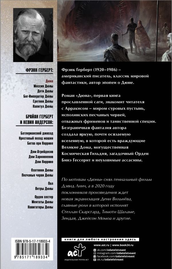 Роман «Дюна», первая книга прославленной саги, знакомит читателя с Арракисом – миром суровых пустынь, исполинских песчаных червей, отважных фрименов и таинственной специи. Безграничная фантазия автора создала яркую, почти осязаемую вселенную, в которой есть враждующие Великие Дома, могущественная Космическая Гильдия, загадочный Орден Бинэ Гессерит и неуловимые ассасины.