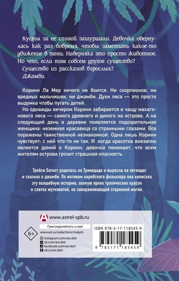 Коринн Ла Мер ничего не боится. Ни скорпионов, ни вредных мальчишек, ни джамби. Духи леса — это просто выдумка, чтобы пугать детей. Но однажды вечером Коринн забирается в чащу махагонового леса — самого древнего и дикого на острове. А на следующий день в деревне появляется подозрительная женщина: неземная красавица со странными глазами. Все поражены таинственной незнакомкой. Одна лишь Коринн чувствует: с ней что-то не так. И когда красотка внезапно является домой к Коринн, девочка понимает, что всем жителям острова грозит страшная опасность.
