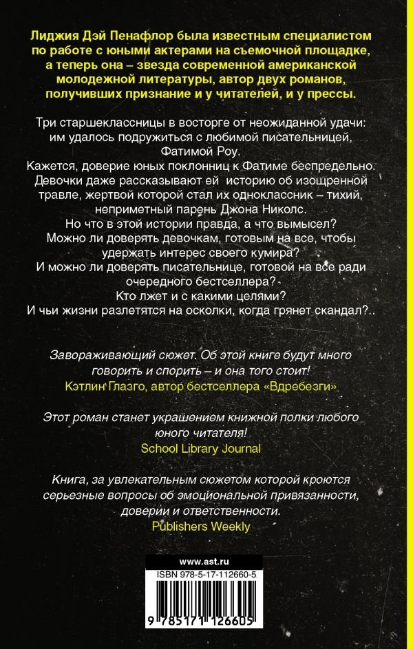 Три старшеклассницы в восторге от неожиданной удачи: им удалось подружиться с любимой писательницей, Фатимой Роу. Кажется, доверие юных поклонниц к Фатиме беспредельно. Девочки даже рассказывают ей историю об изощренной травле, жертвой которой стал их одноклассник – тихий, неприметный парень Джона Николс. Но что в этой истории правда, а что вымысел? Можно ли доверять девочкам, готовым на все, чтобы удержать интерес своего кумира? И можно ли доверять писательнице, готовой на все ради очередного бестселлера? Кто лжет, и с какими целями? И чьи жизни разлетятся на осколки, когда грянет скандал?