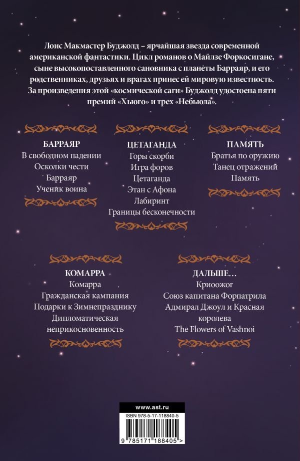 Лоис Макмастер Буджолд – ярчайшая звезда современной американской фантастики. Цикл романов о Майлзе Форкосигане, сыне высокопоставленного сановника с планеты Барраяр, и его родственниках, друзьях и врагах принес ей мировую известность. За произведения этой «космической саги» Буджолд удостоена пяти премий «Хьюго» и трех «Небьюла».