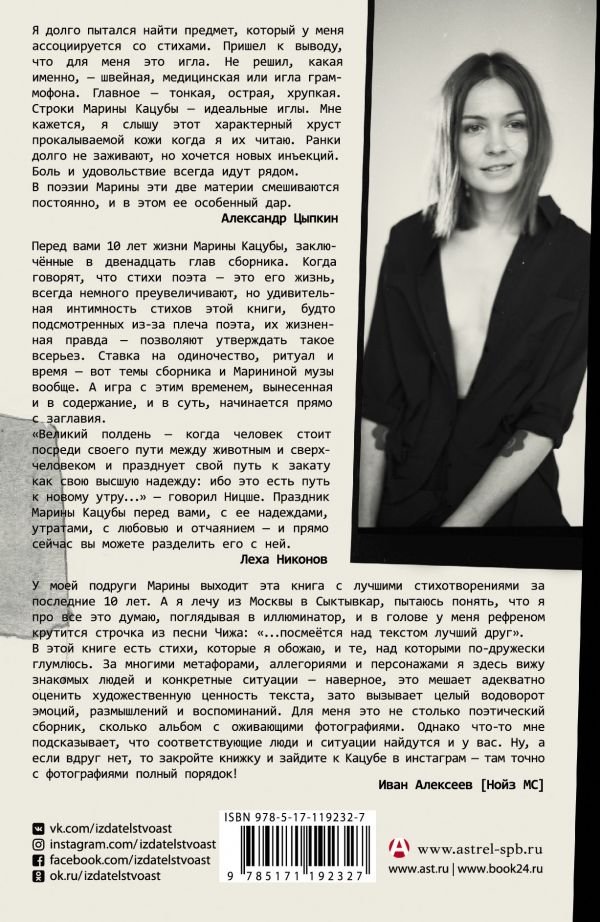 Марина Кацуба за 28 лет творчества и 12 лет публичных выступлений смогла сложить пестрый поэтический пазл в сердцах читателей, зрителей и слушателей далеко за пределами родного Петербурга. Выпустив уже три музыкальных альбома, за собрание сочинений в печатном виде под названием «Июнь» она взялась, только разглядев цикличность среди тысяч своих почти всегда случайных, внезапных стихотворений. Получился календарь, стартующий в начале лета, вместе с первыми цветами и еще хрупким предвкушением пышной жары. Именно в этом месяце поэт вот уже 33 года перерождается и оживает. Каждая из 12 глав – тоже цикл, круг, ибо стихи собраны отнюдь не в хронологическом порядке. В основе их последовательности – принцип соответствия эмоционального посыла и состояния, проживания момента внутри времен года.