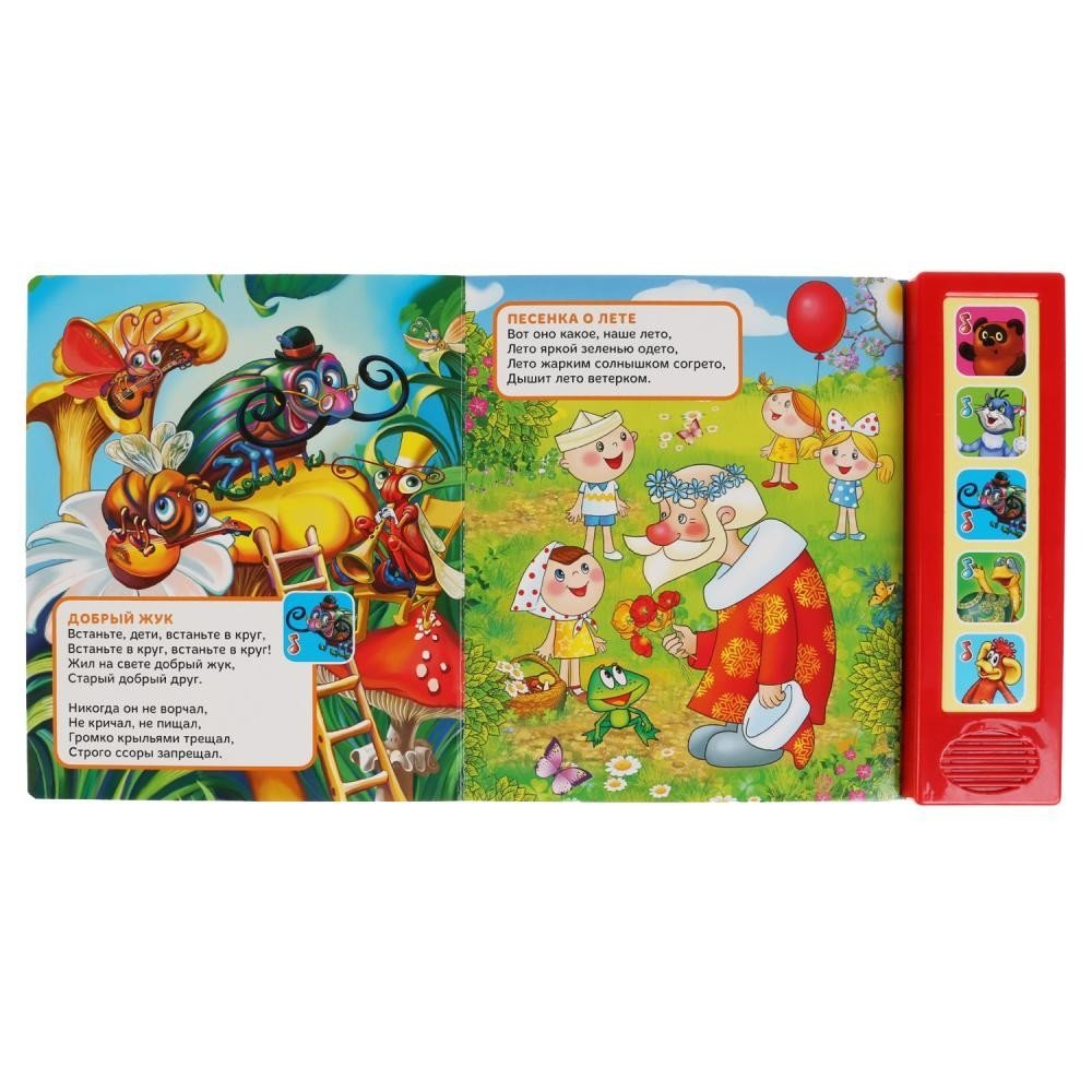 Малыш будет с удовольствием рассматривать яркие картинки, читать, слушать песенки и подпевать. Ребёнок легко освоит включение звука: по нажатию на кнопку звук включится, при втором нажатии выключится. На каждой кнопочке записано по 2 песенки. Композиции исполняются профессиональными артистами. Книжка сделана из плотного картона, поэтому родители могут не опасаться за её сохранность. Благодаря компактному формату её удобно брать с собой.
