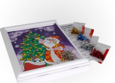 В наборе: основа, цветная схема, рамка, разноцветные пайетки, пины-гвоздики, инструкция.