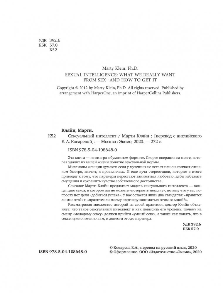 Рассматривая множество историй из своей практики, доктор Кляйн объясняет: что такое сексуальный интеллект и как повысить его уровень; почему на смену "молодому сексу" должен прийти "умный секс", а также как понять, что в сексе нужно именно вам, и донести это до партнера.