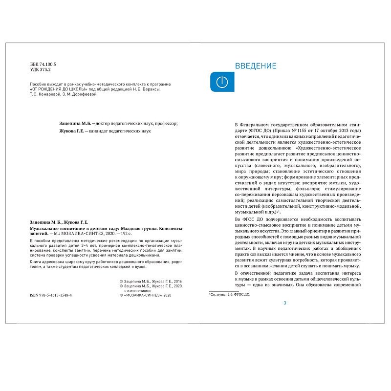 В пособии, выпущенном к программе «От рождения до школы» и соответствующем ФГОС ДО, представлены методические рекомендации по организации музыкального развития детей 3–4 лет, примерное комплексно-тематическое планирование, конспекты занятий, перечень методических пособий для занятий, система проверки успешности усвоения материала дошкольниками.