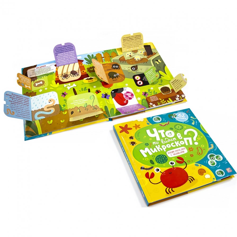 Жизнь вокруг нас состоит из деталей, порой настолько маленьких, что мы о них даже не думаем. Энциклопедия с окошками "Что мы видим в микроскоп?" станет одной из самых любимых у вашего малыша. Внутри книжки 8 разворотов с яркими иллюстрациями и 62 окошка с интересными фактами!