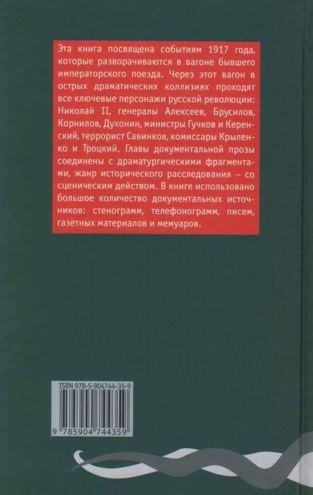 Эта книга посвящена событиям 1917 года, которые разворачиваются в вагоне бывшего императорского поезда. Через этот вагон в острых драматических коллизиях проходят все ключевые персонажи русской революции: Николай II, генералы Алексеев, Брусилов, Корнилов, Духонин, министры Гучков и Керенский, террорист Савинков, комиссары Крыленко и Троцкий. Главы документальной прозы соединены с драматургическими фрагментами, жанр исторического расследования - со сценическим действом.