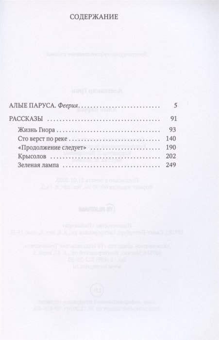 В эту книгу вошли самые таинственные и загадочные рассказы Александра Грина, с которых, по словам автора, начался его путь как писателя, а также его знаменитая романтическая феерия «Алые паруса» (1916-1922) о непоколебимой вере и всепобеждающей, возвышенной мечте, о том, что каждый может сотворить чудо.
