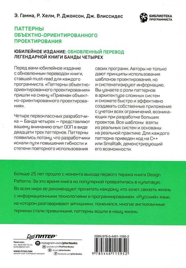Больше 25 лет прошло с момента выхода первого тиража книги Design Patterns. За это время книга из популярной превратилась в культовую. Во всем мире ее рекомендуют прочитать каждому, кто хочет связать жизнь с информационными технологиями и программированием. «Русский» язык, на котором разговаривают айтишники поменялся, многие англоязычные термины стали привычными, паттерны вошли в нашу жизнь. Перед вами юбилейное издание с обновленным переводом книги, ставшей must-read для каждого программиста. «Паттерны объектно-ориентированного проектирования» пришли на смену «Приемам объектно-ориентированного проектирования».Четыре первоклассных разработчика - Банда четырех - представляют вашему вниманию опыт ООП в виде двадцати трех паттернов. Паттерны появились потому, что разработчики искали пути повышения гибкости и степени повторного использования своих программ. Авторы не только дают принципы использования шаблонов проектирования, но и систематизируют информацию. Вы узнаете о роли паттернов в архитектуре сложных систем и сможете быстро и эффективно создавать собственные приложения с учетом всех ограничений, возникающих при разработке больших проектов. Все шаблоны взяты из реальных систем и основаны на реальной практике. Для каждого паттерна приведен код на C ++ или Smalltalk, демонстрирующий его возможности.