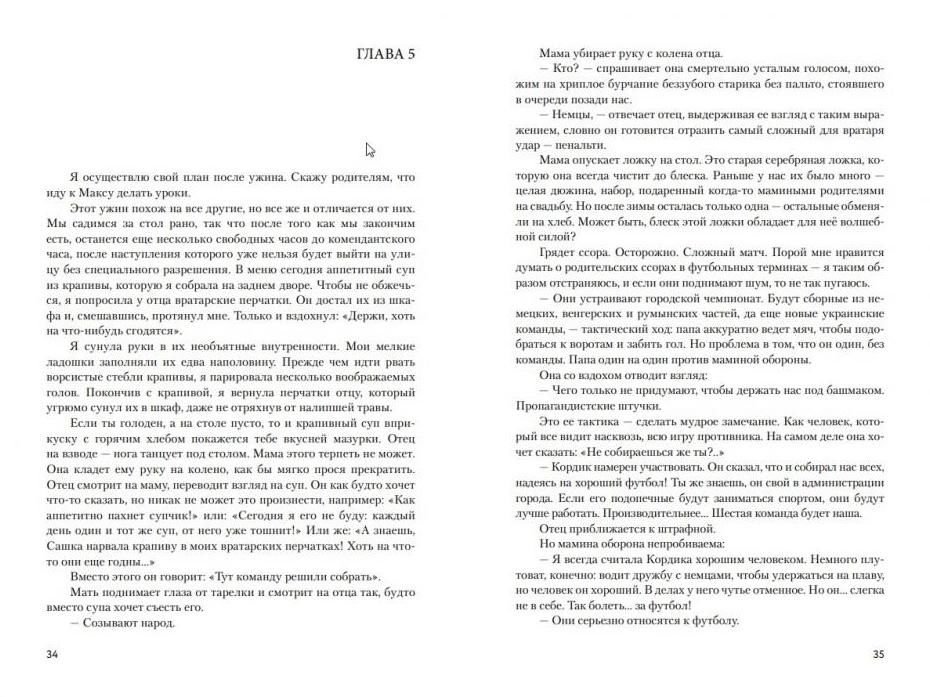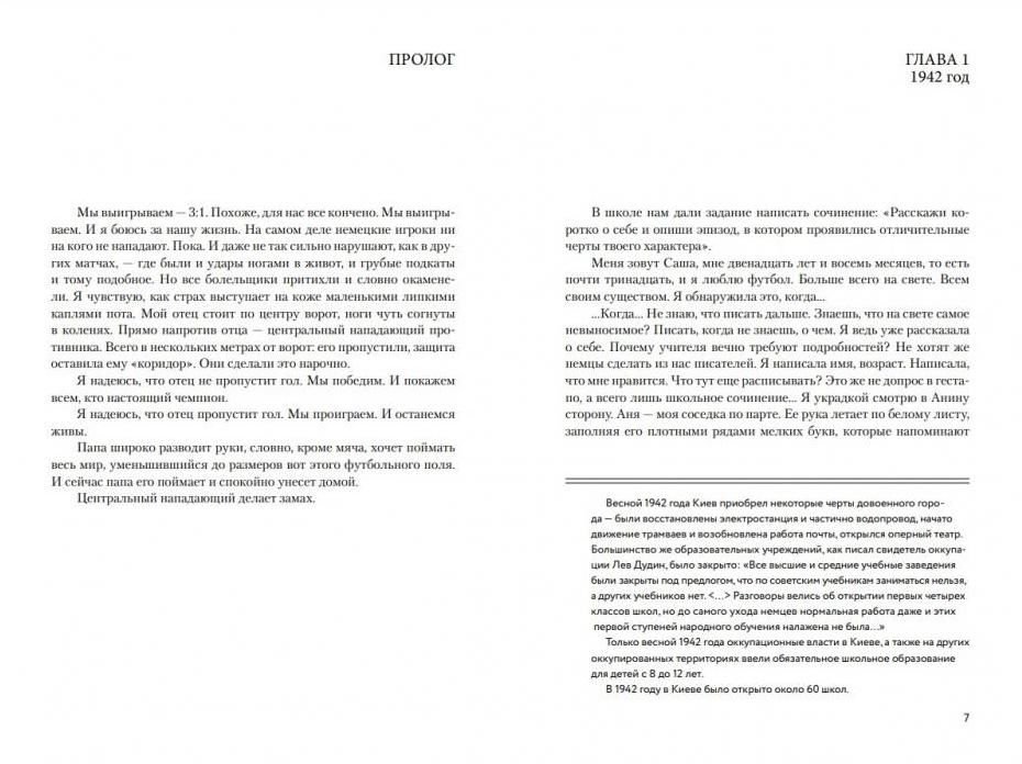 Действие книги итальянского автора Николетты Бортолотти происходит в Киеве, захваченном гитлеровскими войсками. Её героиня Саша - дочь футболиста и сама влюблена в футбол. Жить в оккупированном городе тяжело и опасно: людей арестовывают и убивают, многие голодают. Но нацисты пытаются создать иллюзию «нормальной» жизни, в которой есть место даже спорту. Сашин отец со своими товарищами должен сыграть матч с немецкой командой, и, возможно, им придется заплатить жизнью за победу или поражение.