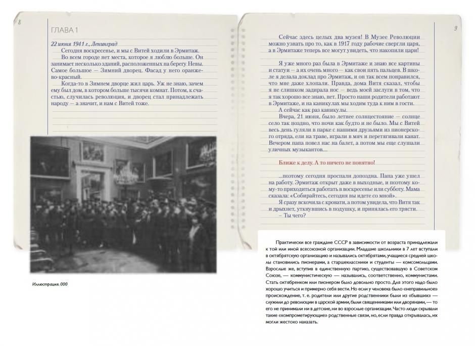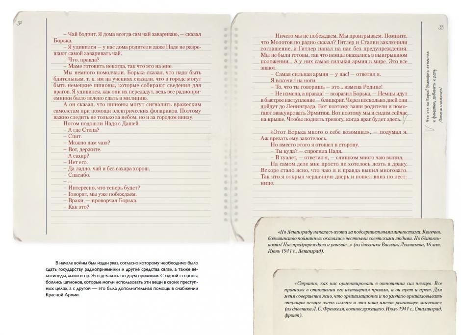 Эта удивительная книга написана в форме двойного дневника, который ведут брат и сестра из Ленинграда, близнецы Надя и Витя. Записи Нади сделаны синим цветом, Вити - красным, а на полях время от времени появляются сухие чёрные пометки следователя - дневники были приобщены к делу арестованного после войны Виктора.