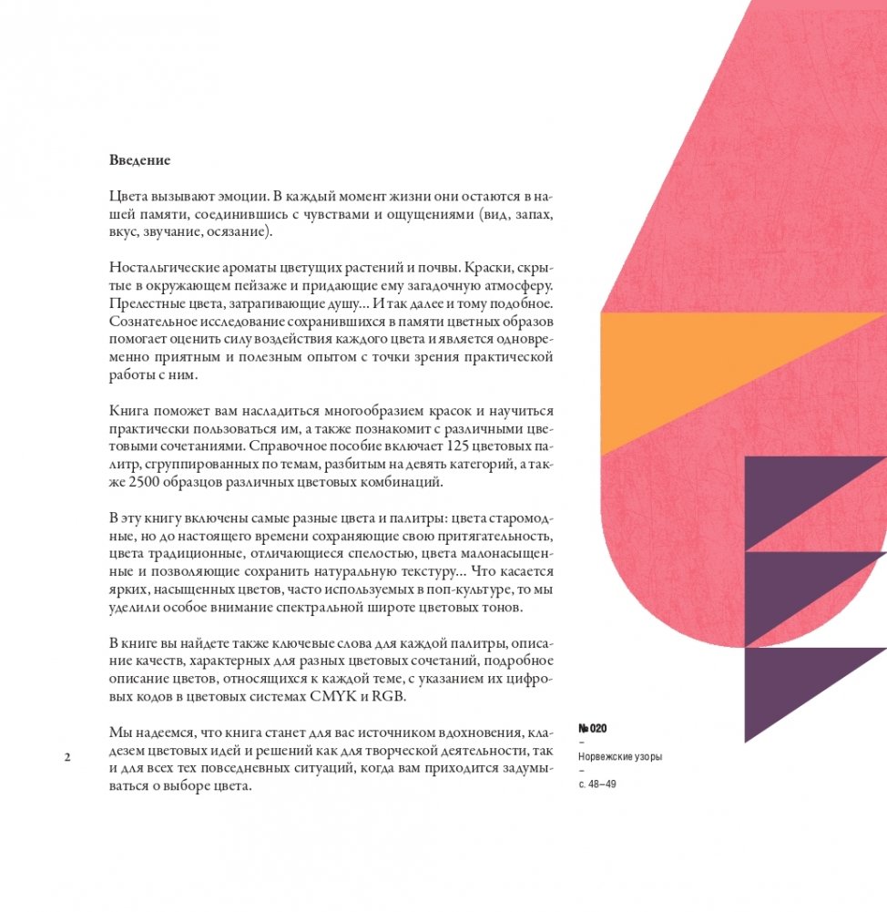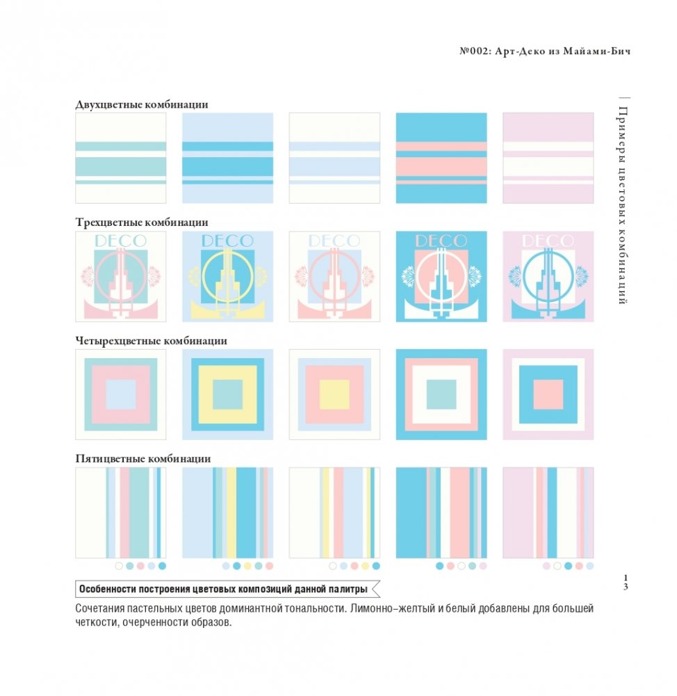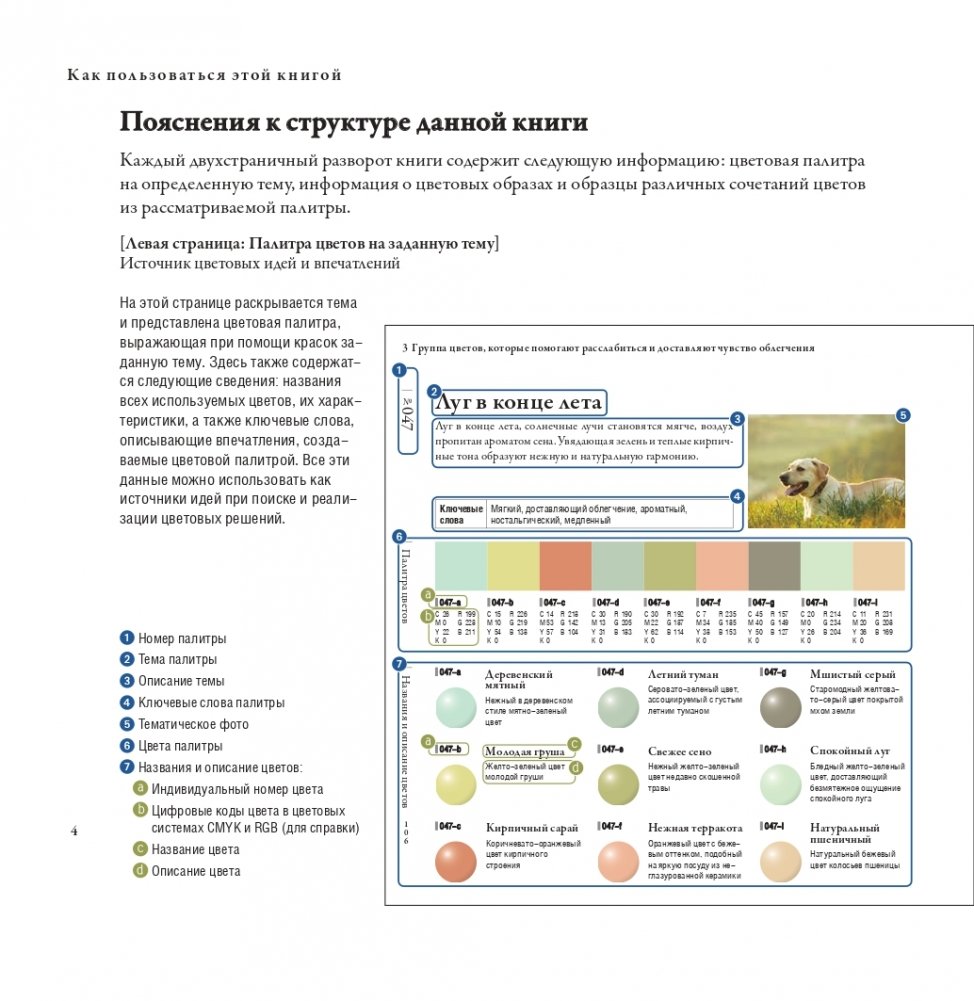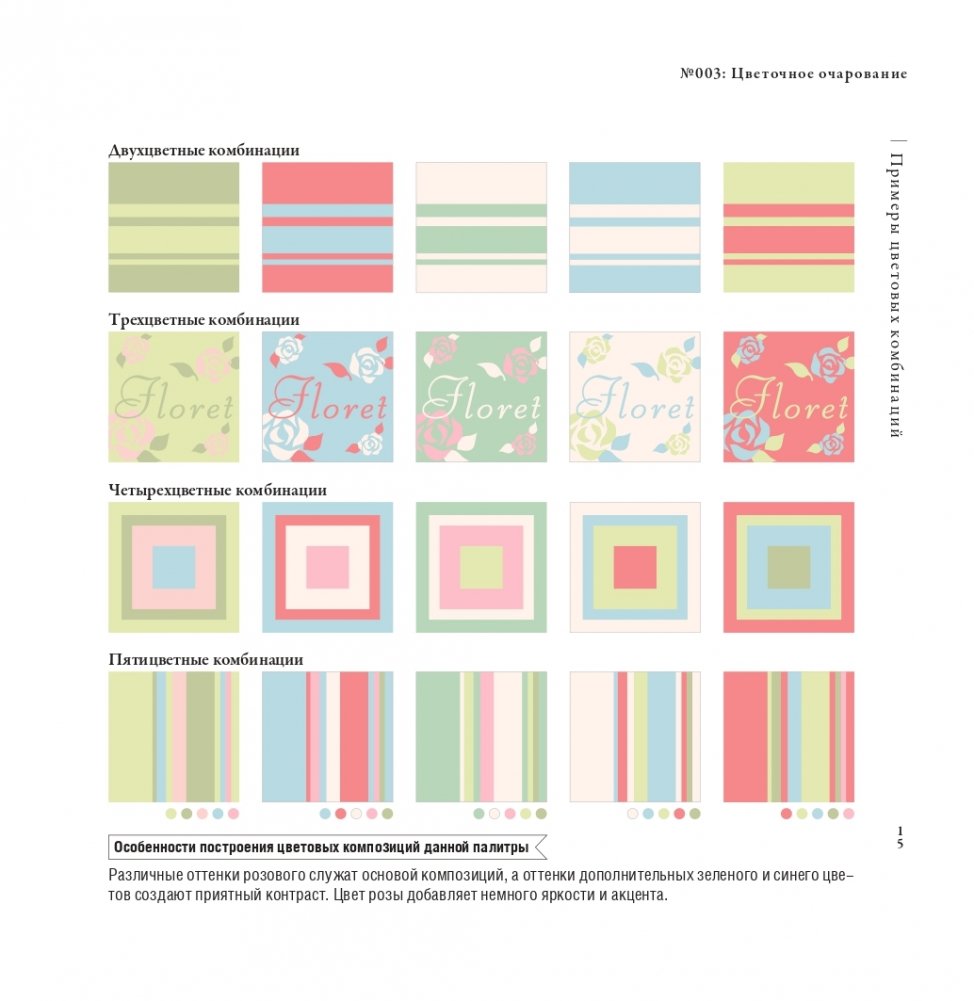 Книга включает описания 125 цветовых палитр, каждая из которых соотносится с определенной темой или категорией. В состав этих палитр входит около 1100 отдельных цветов с указанием их кодов по системам CMYK и RGB. Также вы найдете здесь более 2500 уникальных образцов цветовых комбинаций, полученных путем сочетания цветов из палитры по два, по три, по четыре и по пять. Каждая палитра сопровождается четкими характеристиками составляющих ее цветов и важными замечаниями по их возможным сочетаниям.