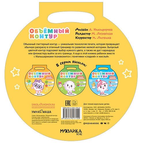 Книга «Фрукты» из серии «Малышарики. Объемный контур» — не просто раскраска с героями любимого мультсериала, а развивающая книжка с объемным блестящим контуром. Благодаря уникальной технологии печати обыкновенная раскраска превращается в отличный тренажер по развитию мелкой моторики. Выпуклый контур не даст карандашу или фломастеру выйти за его границы, и раскрашенная картинка получится аккуратной. А цвет контура подскажет выбор нужного карандаша для раскрашивания. Отличный результат вдохновит ребенка на дальнейшее творчество. Благодаря таким занятиям у ребенка постепенно будет формироваться контроль движения руки.
