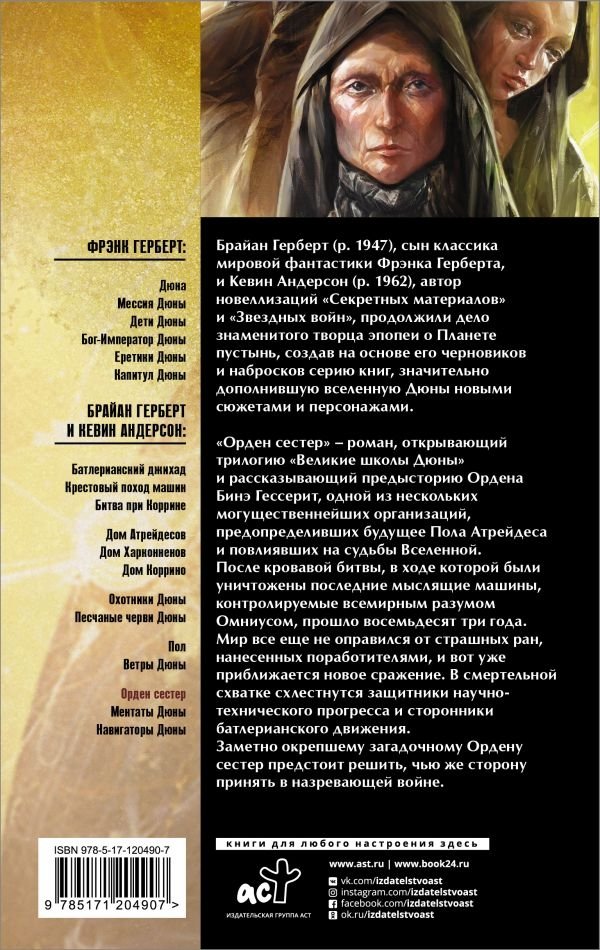 «Орден сестер» – роман, открывающий трилогию «Великие школы Дюны» и рассказывающий предысторию Ордена Бинэ Гессерит, одной из нескольких могущественнейших организаций, предопределивших будущее Пола Атрейдеса и повлиявших на судьбы Вселенной.
