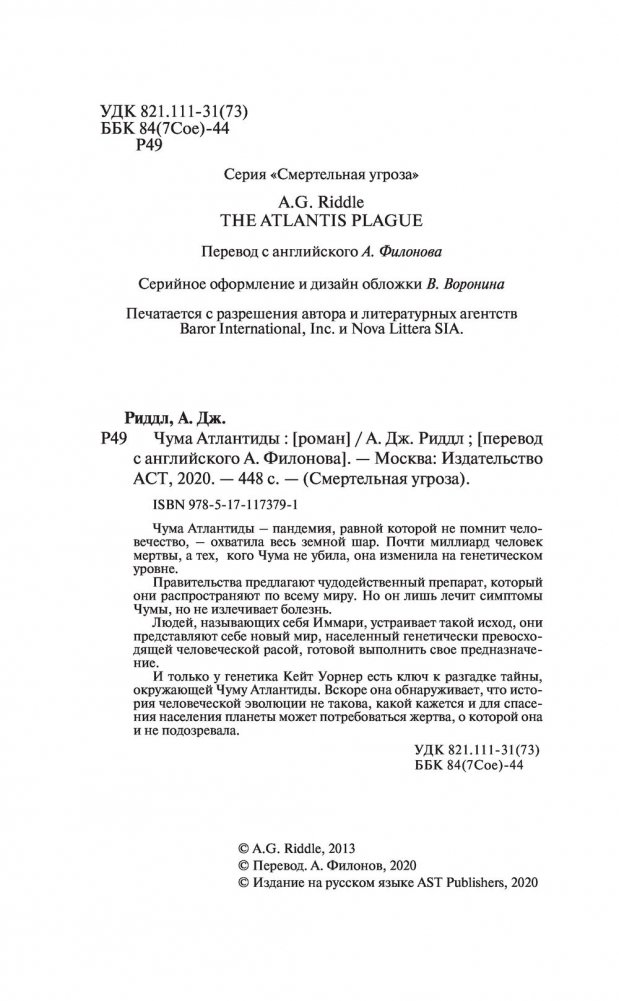 И только у генетика Кейт Уорнер есть ключ к разгадке тайны, окружающей Чуму Атлантиды. Вскоре она обнаруживает, что история человеческой эволюции не такова, какой кажется и для спасения населения планеты может потребоваться жертва, о которой она и не подозревала.
