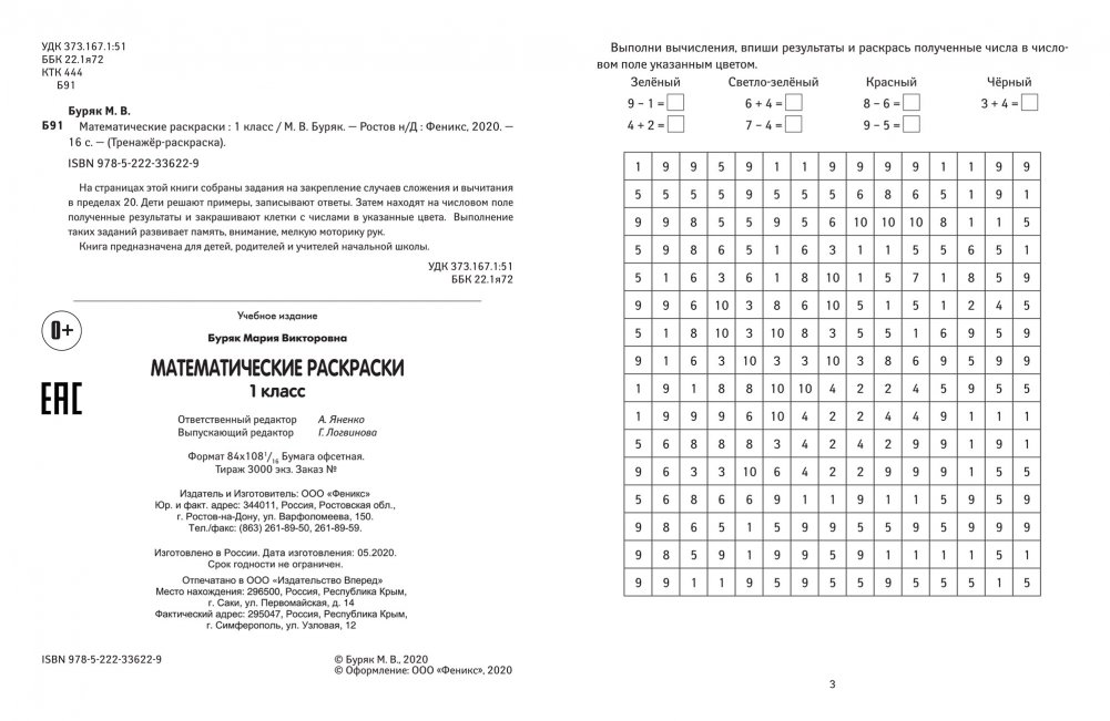 На страницах этой книги собраны задания на закрепление случаев сложения и вычитания в пределах 20. Дети решают примеры, записывают ответы. Затем находят на числовом поле полученные результаты и закрашивают клетки с числами в указанные цвета. Выполнение таких заданий развивает память, внимание, мелкую моторику рук.