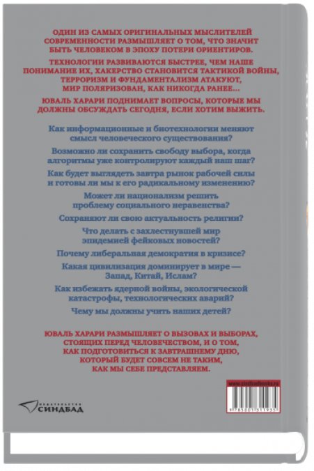 «21 урок для XXI века» — третья книга Юваля Харари, автора изданных на 50 языках мира бестселлеров «Sapiens. Краткая история человечества» и «Homo Deus. Краткая история будущего». В ней сорокатрехлетний профессор истории, которого называют самым ярким мыслителем нашего времени, обратился к проблемам сегодняшнего дня. Что происходит в современном мире и каков глубинный смысл этих событий? Почему либеральная демократия переживает кризис? Как быть с эпидемией фейковых новостей? Как не стать рабами компьютерных алгоритмов? Удастся ли предотвратить экологический коллапс? Действительно ли происходит возврат к религии? Как бороться с терроризмом? Будет ли новая мировая война? От того, сумеет ли человечество найти адекватные ответы на вызовы, стоящие перед ним в XXI веке, зависит, будет ли существовать планета Земля и ее обитатели в следующем столетии.