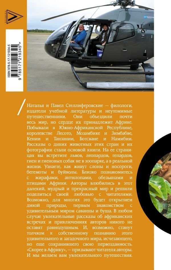 Наталья и Павел Стеллиферовские – филологи, издатели учебной литературы и неутомимые путешественники. Они объездили почти весь мир, но сердце их принадлежит Африке. Побывали в Южно-Африканской республике, королевстве Лесото, Мозамбике и Зимбабве, Кении и Танзании, Ботсване и Намибии. Рассказы о диких животных этих стран и их фотографии стали основой книги. На ее страницах вы встретите львов, леопардов, гепардов, гиен и гиеновых собак не в зоопарке, а в реальной жизни. Узнаете, как живут слоны и носороги, бегемоты и буйволы. Близко познакомитесь с жирафами, антилопами, обезьянами и птицами Африки. Авторы влюбились в этот далекий, мудрый и прекрасный мир и решили поделиться своей любовью с читателями. Возможно, для многих это будет открытием дикой природы, первым знакомством с удивительным миром саванны и буша. В любом случае увлекательные рассказы об африканских встречах и приключениях авторов никого не оставят равнодушным. И, возможно, станут толчком к собственному познанию этого удивительного и загадочного мира, исчезающего, но еще сохранившего свою первозданность. «Скорее в Африку», – призывают читателя авторы. И мы желаем вам увлекательного путешествия.