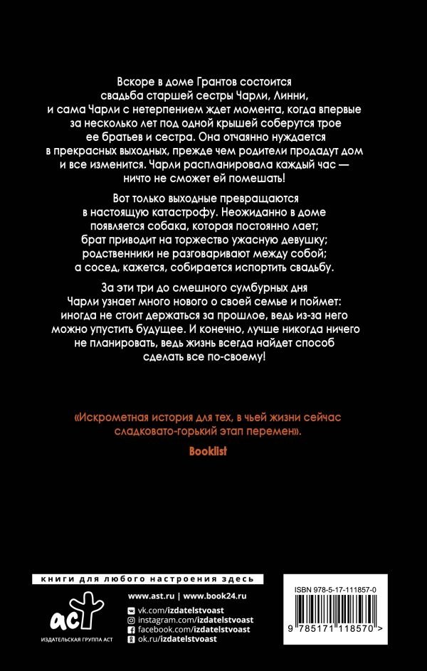 Вскоре в доме Грантов состоится свадьба старшей сестры Чарли, Линни, и сама Чарли с нетерпением ждет момента, когда впервые за несколько лет под одной крышей соберутся трое ее братьев и сестра. Она отчаянно нуждается в прекрасных выходных, прежде чем родители продадут дом и все изменится. Чарли распланировала каждый час – ничто не сможет ей помешать!