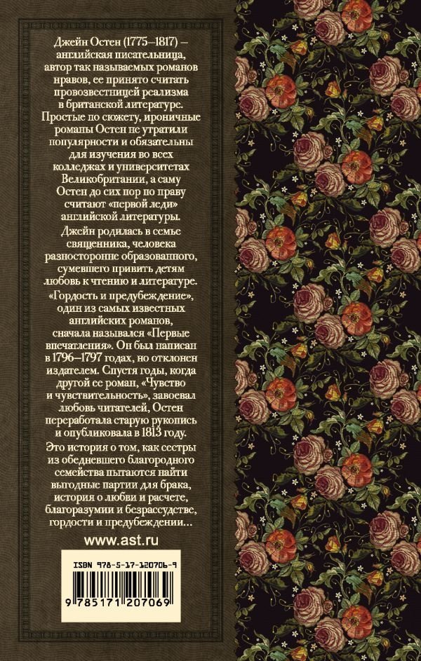 "Гордость и предубеждение", один из самых известных английских романов, сначала назывался "Первые впечатления". Он был написан в 1796—1797 гг., но отклонен издателем. Спустя годы, когда другой ее роман "Чувство и чувствительность" завоевал любовь читателей, Остен переработала старую рукопись и опубликовала в 1813 г. Это история о том, как сестры из обедневшего благородного семейства пытаются найти выгодные партии для брака, история о любви и расчете, благоразумии и безрассудстве, гордости и предубеждении…