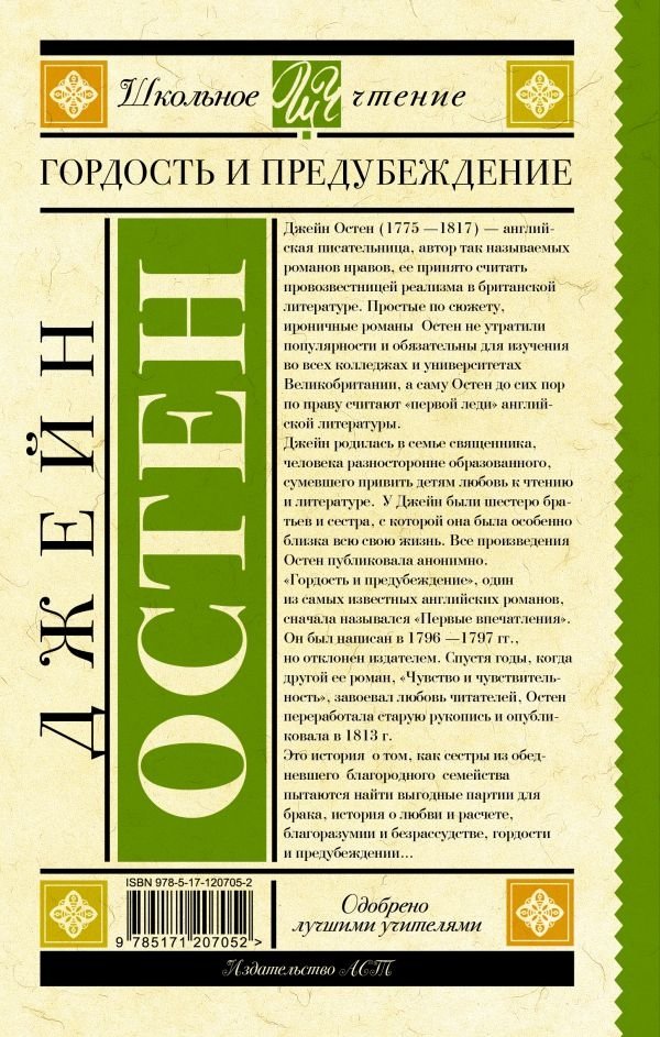 "Гордость и предубеждение", один из самых известных английских романов, сначала назывался "Первые впечатления". Он был написан в 1796—1797 гг., но отклонен издателем. Спустя годы, когда другой ее роман "Чувство и чувствительность" завоевал любовь читателей, Остен переработала старую рукопись и опубликовала в 1813 г. Это история о том, как сестры из обедневшего благородного семейства пытаются найти выгодные партии для брака, история о любви и расчете, благоразумии и безрассудстве, гордости и предубеждении…