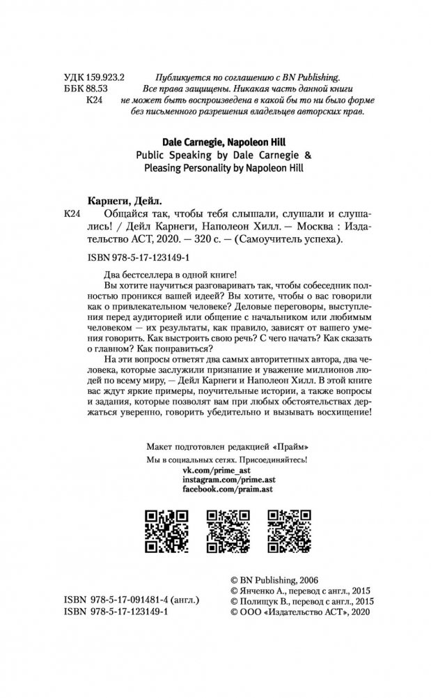 Два бестселлера в одной книге! Вы хотите научиться разговаривать так, чтобы собеседник полностью проникся вашей идеей? Вы хотите, чтобы о вас говорили как о привлекательном человеке? Деловые переговоры, выступления перед аудиторией или общение с начальником или любимым человеком — их результаты, как правило, зависят от вашего умения говорить. Как выстроить свою речь? С чего начать? Как сказать о главном? Как понравиться? На эти вопросы ответят два самых авторитетных автора, два человека, которые заслужили признание и уважение миллионов людей по всему миру, — Дейл Карнеги и Наполеон Хилл. В этой книге вас ждут яркие примеры, поучительные истории, а также вопросы и задания, которые позволят вам при любых обстоятельствах держаться уверенно, говорить убедительно и вызывать восхищение!