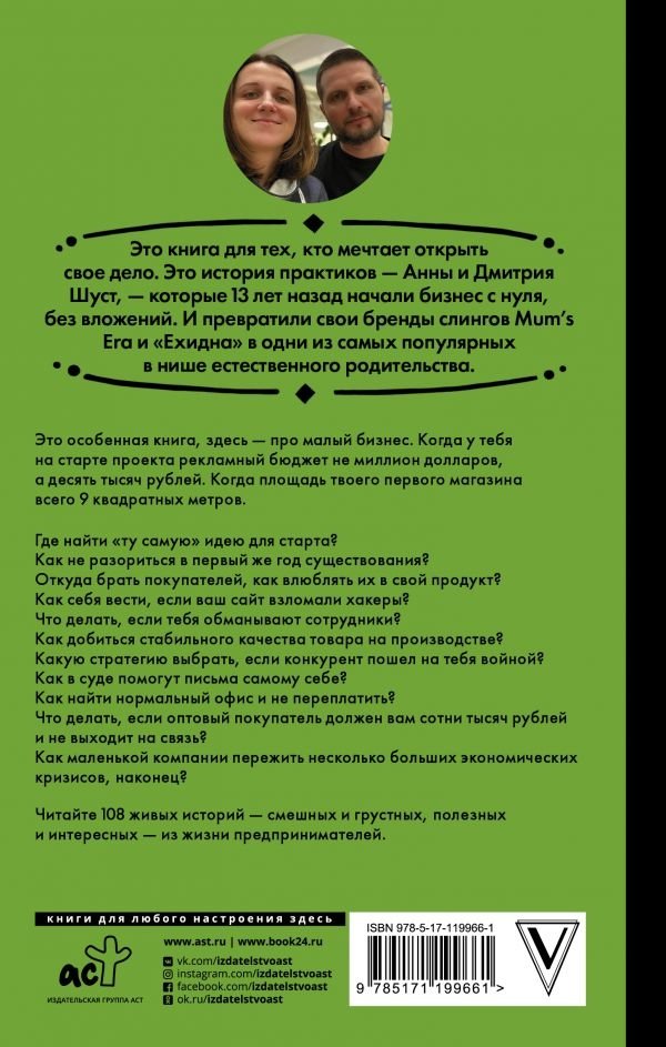 Это книга для тех, кто мечтает открыть свое дело. Это история практиков — Анны и Дмитрия Шуст, — которые 13 лет назад начали бизнес с нуля, без вложений. И превратили свои бренды слингов Mum’s Era и "Ехидна" в одни из самых популярных в нише естественного родительства.