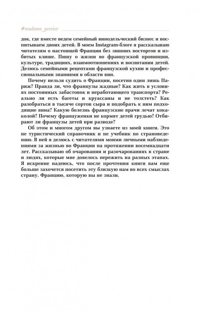 Какая она, сегодняшняя Франция, и насколько отличается от почтовой открытки с Эйфелевой башней, беретами и аккордеоном? Как жить в стране, где месяцами не ходят поезда из-за забастовок? Как научиться разбираться в тысяче сортов сыра, есть их и не толстеть? Правда ли, что мужья-французы жадные и при разводе отбирают детей? Почему француженки вместо маленьких черных платьев носят дырявые колготки? Что делать, когда дети из школы вместо знаний приносят вшей, а приема у врача нужно ожидать несколько месяцев? Обо всем этом и многом другом вы узнаете из первых рук от Марии Перрье, автора книги и популярного Instagram-блога о жизни в настоящей Франции, @madame_perrier.