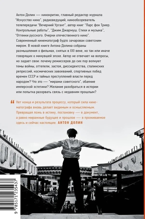 Современный кинематограф будто зачарован советским миром. В новой книге Антона Долина собраны размышления о фильмах, снятых в XXI веке, но так или иначе говорящих о минувшей эпохе. Автор не отвечает на вопросы, но задает свои: почему режиссеров до сих пор волнуют темы войны, оттепели, застоя, диссидентства, сталинских репрессий, космических завоеваний, спортивных побед времен СССР и тайных преступлений власти перед народом? Что это — “миражи советского”, обаяние имперской эстетики? Желание разобраться в истории или попытка разорвать связь с недавним прошлым?