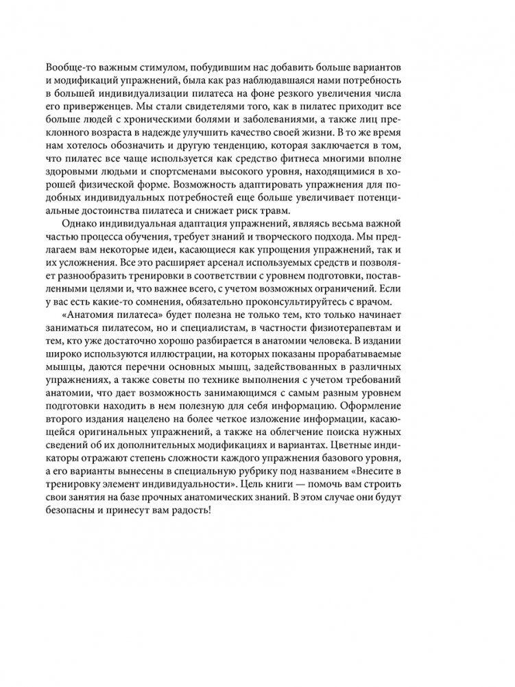 Таким пилатес вы еще не видели! Подробные описания, пошаговые инструкции и полноцветные анатомические иллюстрации позволяют вам в буквальном смысле слова заглянуть внутрь каждого упражнения, чтобы повысить мышечный тонус, улучшить гибкость тела и стабилизировать центр тяжести. Это пособие поможет вам понять, какие мышцы используются в упражнениях и как даже самые мелкие нововведения и вариации могут повлиять на их эффективность. Вы также узнаете, как осуществляется взаимосвязь дыхания, осанки, положения и движений вашего тела.