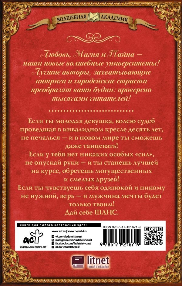 Если ты молодая девушка, волею судеб проведшая в инвалидном кресле десять лет, не печалься – и в новом мире ты сможешь даже танцевать! Если у тебя нет никаких особых "сил", не опускай руки - и ты станешь лучшей на курсе, обретешь могущественных и смелых друзей! Если ты чувствуешь себя одинокой и никому не нужной, верь – и мужчина мечты будет только твоим! Дай себе ШАНС.