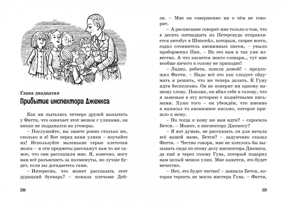 Юные сыщики и пёс-детектив снова вместе и готовы расследовать самые таинственные дела. Но увы, в Петерсвуде всё спокойно и ничего необычного не происходит, кроме неожиданного отъезда Глэдис – горничной Пипа и Бетси. Ребята уверены, что всё не так просто, как заявляют взрослые, и оказываются правы. Жители Петерсвуда один за другим стали получать неприятные анонимные послания. Кто же автор этих загадочных писем? Эту тайну раскроют пятеро юных сыщиков и пёс-детектив!